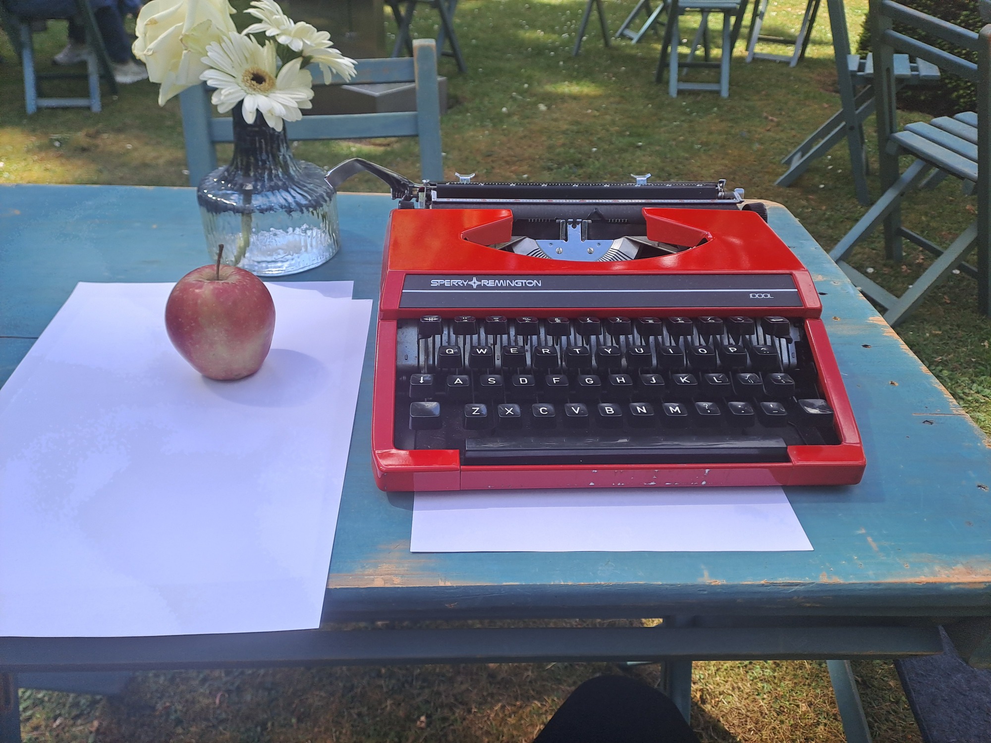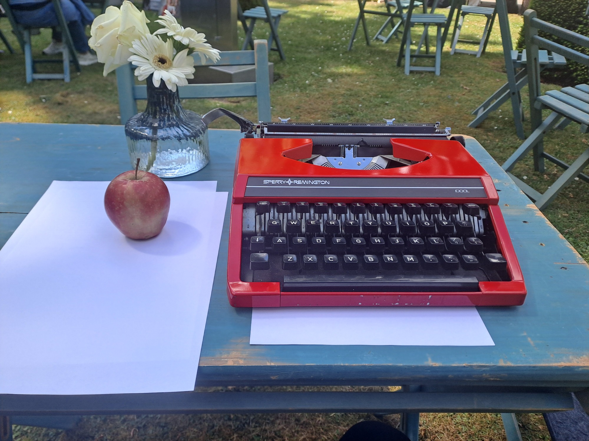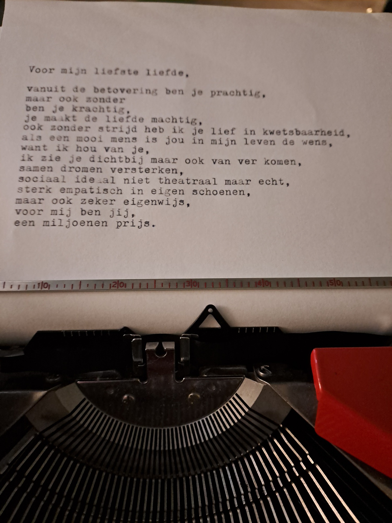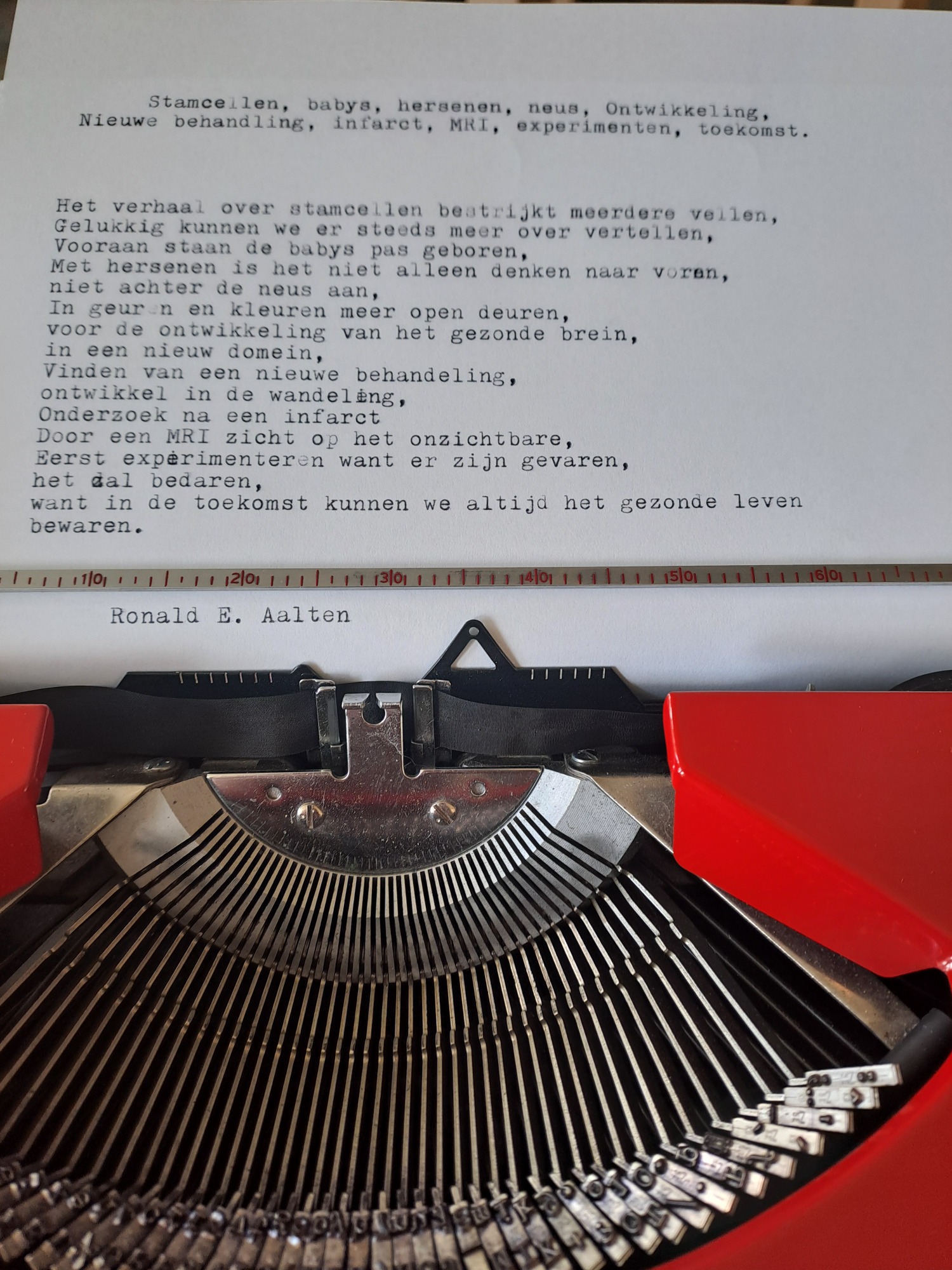 Met mijn Rode typemachine ben ik in te huren voor verschillende gelegenheden. Ik schrijf graag poezie en wil dat ook delen. Om het dichterbij mensen te brengen bedacht ik het concept "Geef mij 10 woorden en ik geef jou een gedicht". Na een tijdje dit te hebben uitgeprobeerd in Woerden in de bibliotheek en Boeken winkel "De Kler". (waar je me nog regelmatig kan vinden.) Heb ik het zelfvertrouwen gevonden om de volgende stap te zetten. Met dat ik dus mobiel ben en op veel plekken terecht kan, ben ik benieuwd naar waar dit avontur mij gaat brengen. Om het dichterschap toegankelijk te maken raad ik het iedereen aan. Om te maken of te lezen. Voor iedere gebeurtenis is wel een gedicht te schrijven. Zelf vind ik het leuk en altijd een verassing welke 10 woorden zijn weg vinden. De enige criteria die ik hanteer is dat de woorden in de "dikke van dale" moeten voorkomen. Bij mij hebben de thema's allemaal wel een keer de revu gepasseerd. Van liefde tot verdriet tot steun tot verjaardag tot gewoon een verzameling onzin. Ik ben per uur in te zetten en probeer altijd een gedicht per 10 minuten te maken. Kijk op deze pagina naar een aantal foto's om een beeld te krijgen wat ik doe. Voor mij is het in essentie cadeautjes maken op papier en af en toe een beetje wijsheid mee te geven. Als het lukt ook wat hoop en kracht. Ik kan natuurlijk ook een gedicht schrijven speciaal voor een gelegenheid, denk aan verjaardag of pensioen of gewoon omdat iemand dat verdient. Een mail sturen met verdere vragen is altijd goed en kan naar Info@reapoetry.nl